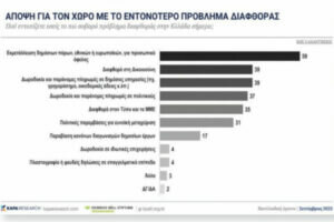 Στίς πρῶτες θέσεις συναντᾶμε καί τά Μέσα Ἐνημερώσεως, μέ ποσοστό 37%, καί ἀκολουθοῦν οἱ πολιτικές παρεμβάσεις γιά εὐνοϊκή μεταχείριση καί ἡ παραβίασις τῶν κανόνων διαγωνισμῶν δημοσίων ἔργων, πού μετά τήν κρίση ἔχουν ἐπιστρέψει δυναμικά.