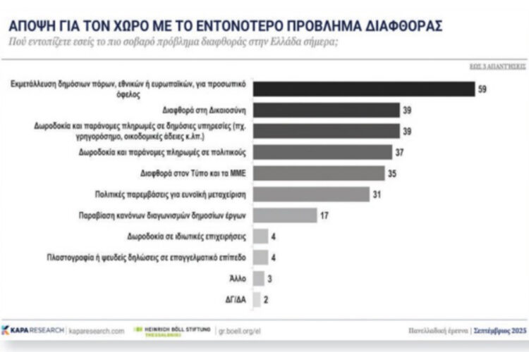 Eάν κάποιος πίστευε ὅτι ἀρκετά χρόνια μετά τήν ὑποτιθέμενη ἔξοδο ἀπό τήν κρίση –ὄχι μόνο τήν οἰκονομική– οἱ Ἕλληνες θά βαθμολογοῦσαν καλύτερα τούς θεσμούς, θά κυριαρχοῦσε τό συναίσθημα τῆς ἐλπίδος καί τῆς αἰσιοδοξίας καί οἱ δυσλειτουργίες τῆς κρατικῆς μηχανῆς τῶν τελευταίων δεκαετιῶν θά ἀποτελοῦσαν παρελθόν, πλανᾶται πλάνην οἰκτρά. Δυστυχῶς γιά τήν χώρα μας, ἡ διαφθορά ὄχι μόνο ζεῖ, ἀλλά κυριολεκτικά βασιλεύει. Καί μήν φανταστεῖ κανείς ὅτι αὐτό τό ὑποστηρίζουν μόνο οἱ ψηφοφόροι τῶν κομμάτων τῆς ἀντιπολιτεύσεως. Ἀπαντῶντας σέ μεγάλη πανελλαδική ἔρευνα τῆς Kapa Research γιά τό Ἵδρυμα Χάινριχ Μπέλ στήν Θεσσαλονίκη μέ θέμα «Πολῖτες καί Πολιτεία: Ἐμπιστοσύνη, ἀνισότητα εὐκαιριῶν, πολιτική συμμετοχή», τό 97% τῶν πολιτῶν ἐκτιμᾶ ὅτι ἡ διαφθορά εἶναι διαδεδομένη στήν Ἑλλάδα. Τήν ἴδια ὅμως ἄποψη ἔχει τό 94% τῶν ψηφοφόρων τῆς ΝΔ, ἡ ὁποία, σημειωτέον, κυβερνᾶ τήν χώρα τά τελευταῖα ἕξι χρόνια καί εἶχε κάποτε κεντρικό σύνθημα τήν πάταξη τῆς διαφθορᾶς.